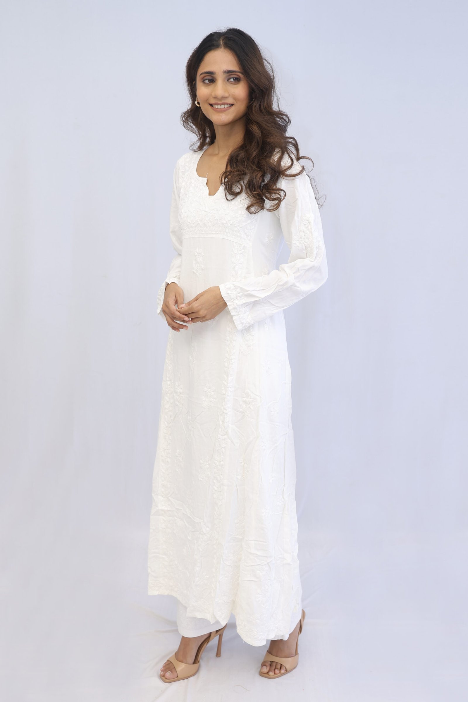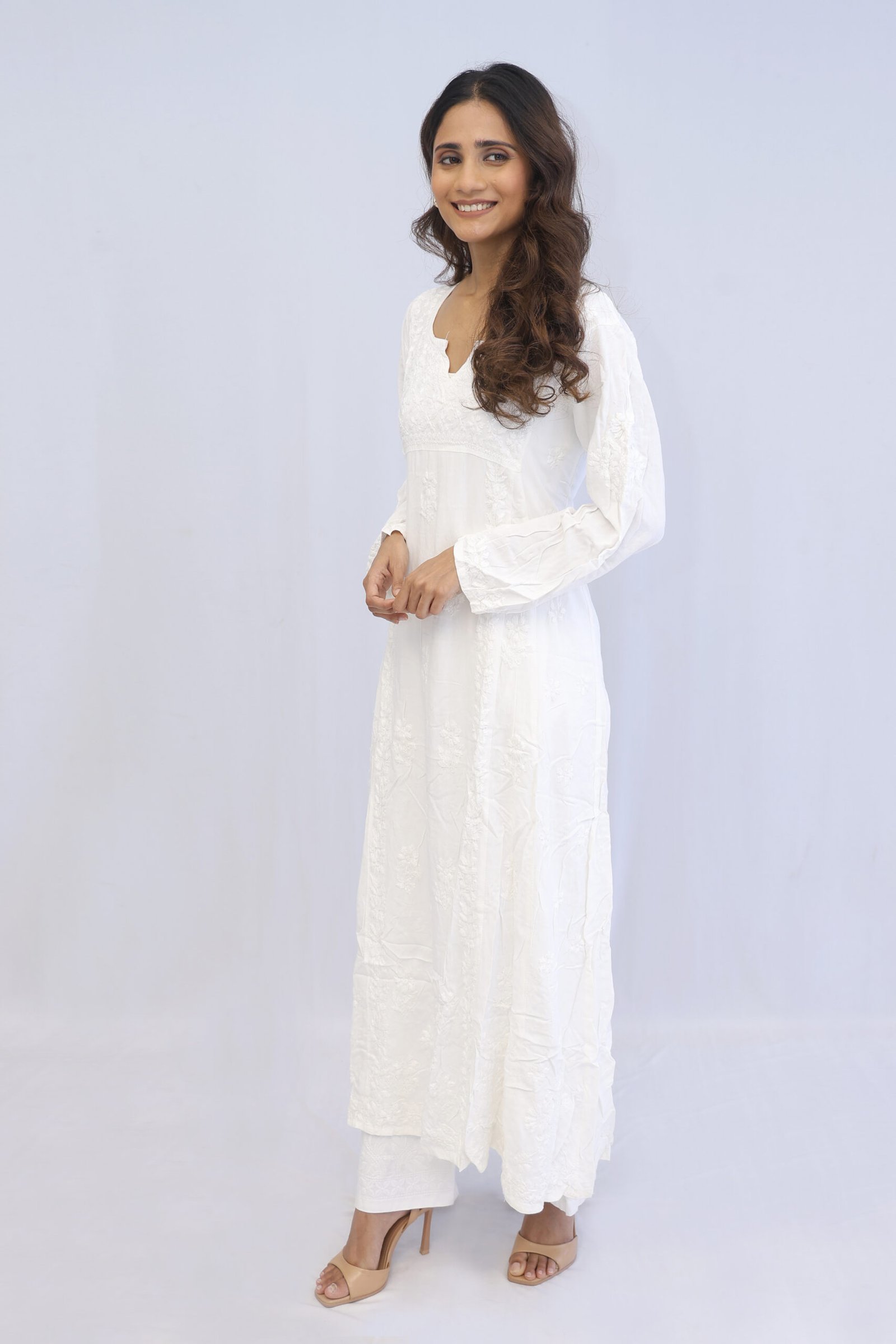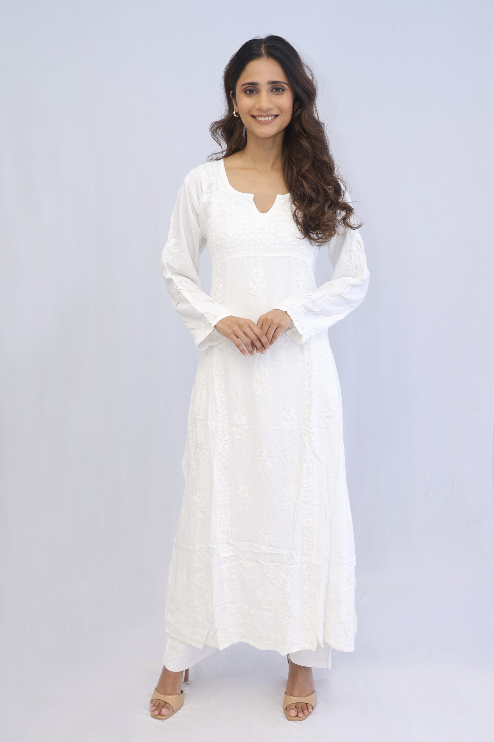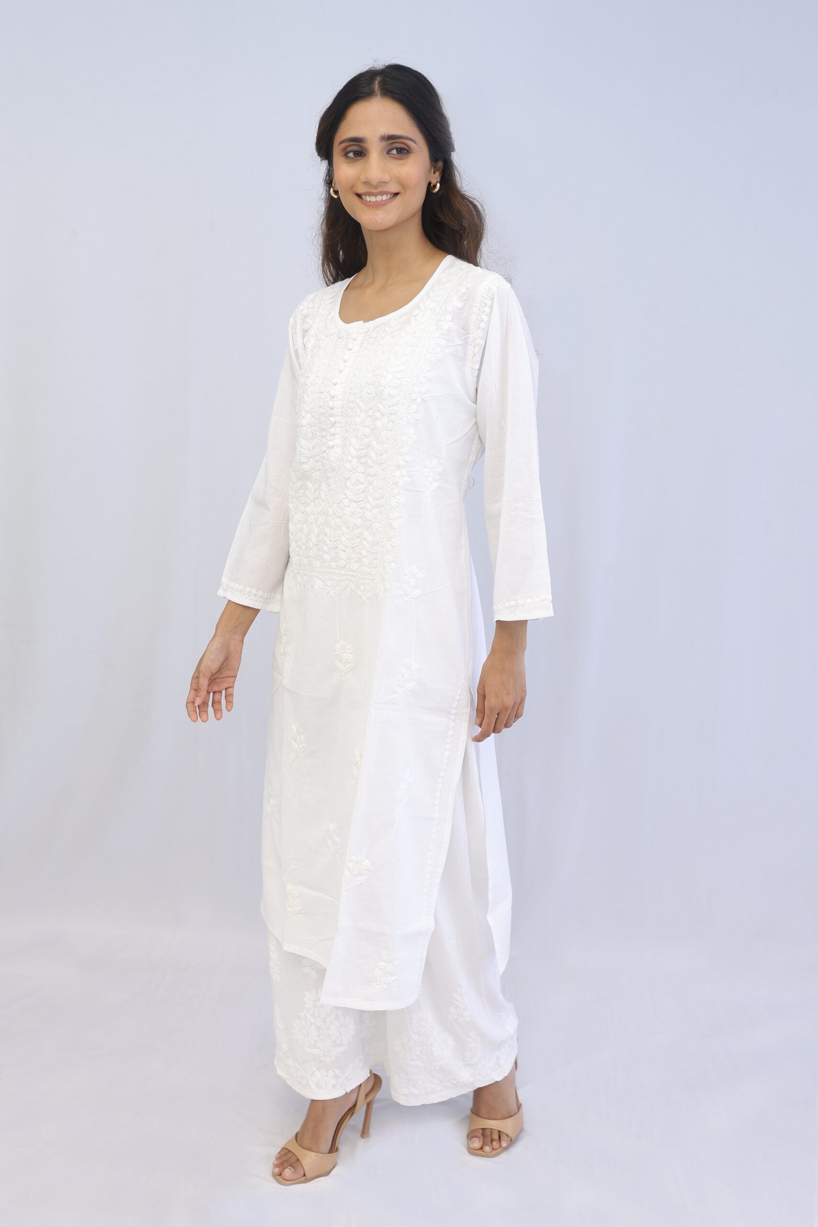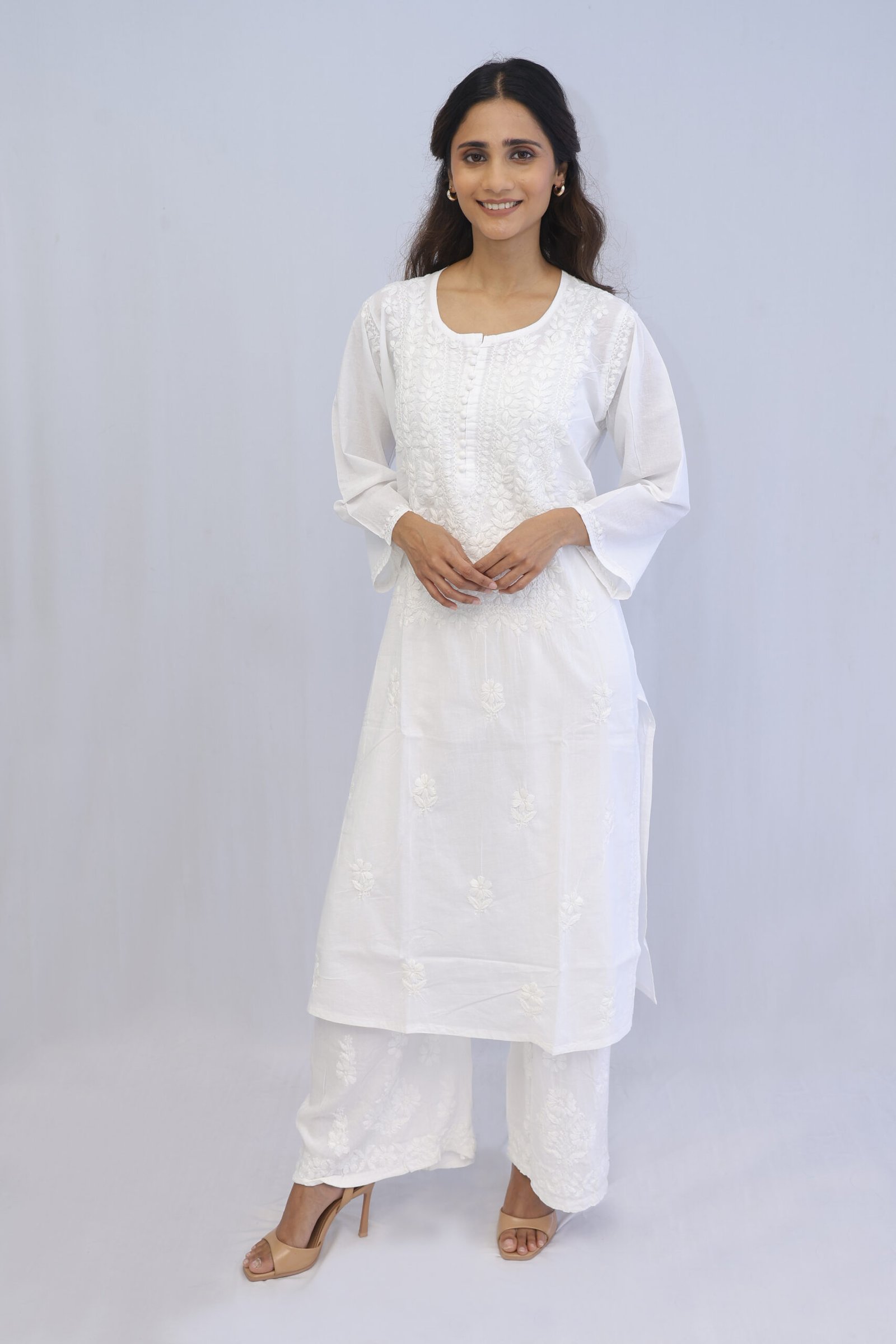 Hand made Elegant Chikankari White Kurta Pant set. Heavy Luchbowi work hand stitched, Rayon Modal material Quantity – 2 – Kurta and Pant Set